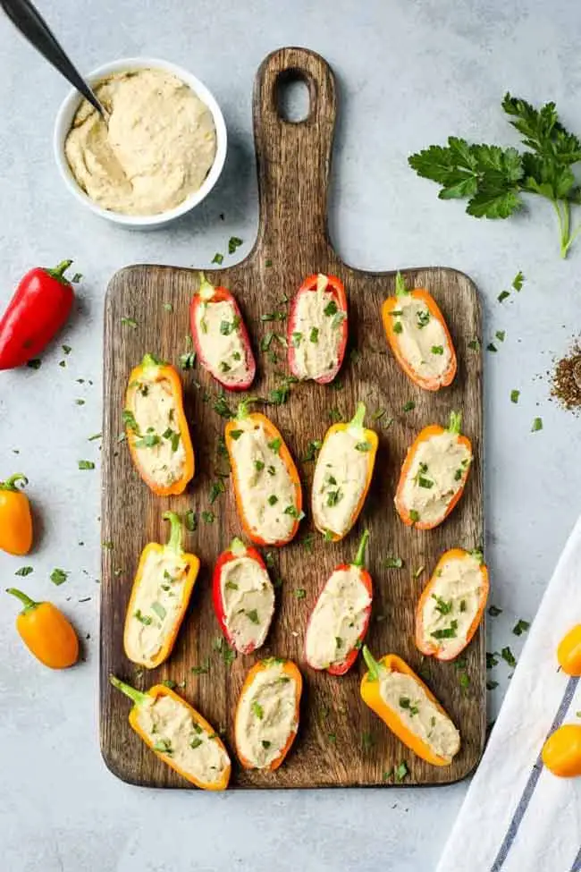 Wash and slice your bell peppers in half, discarding the seeds and stems. Place them on a small plate. Spoon a dollop of hummus into each bell pepper half. Add any optional toppings you like.